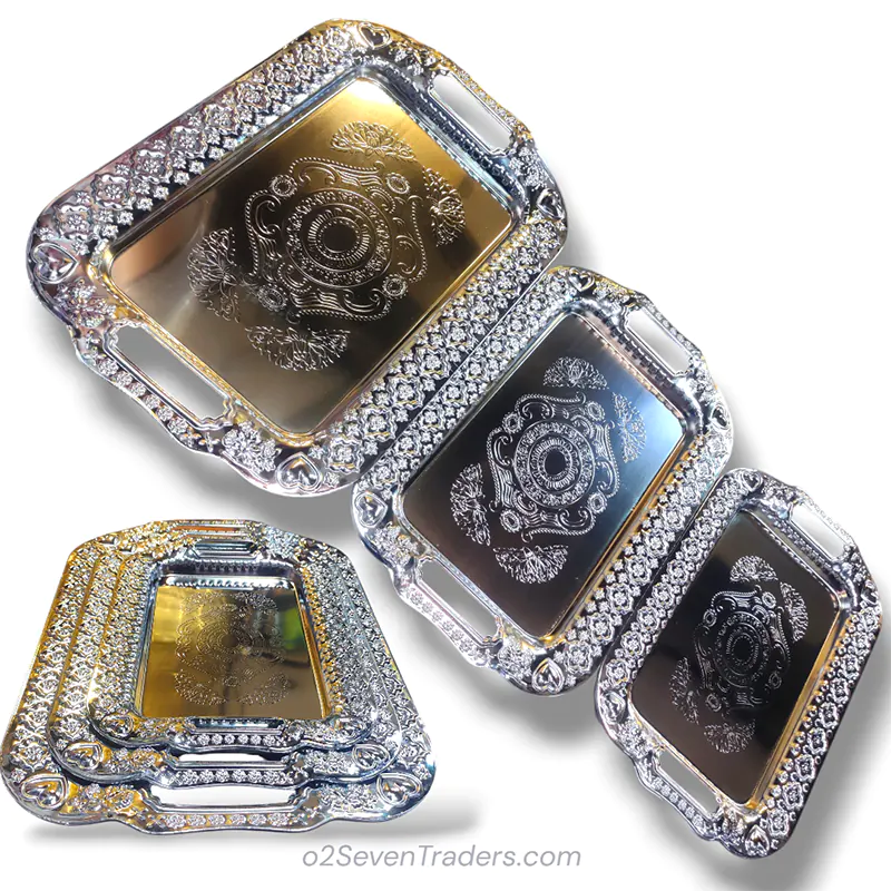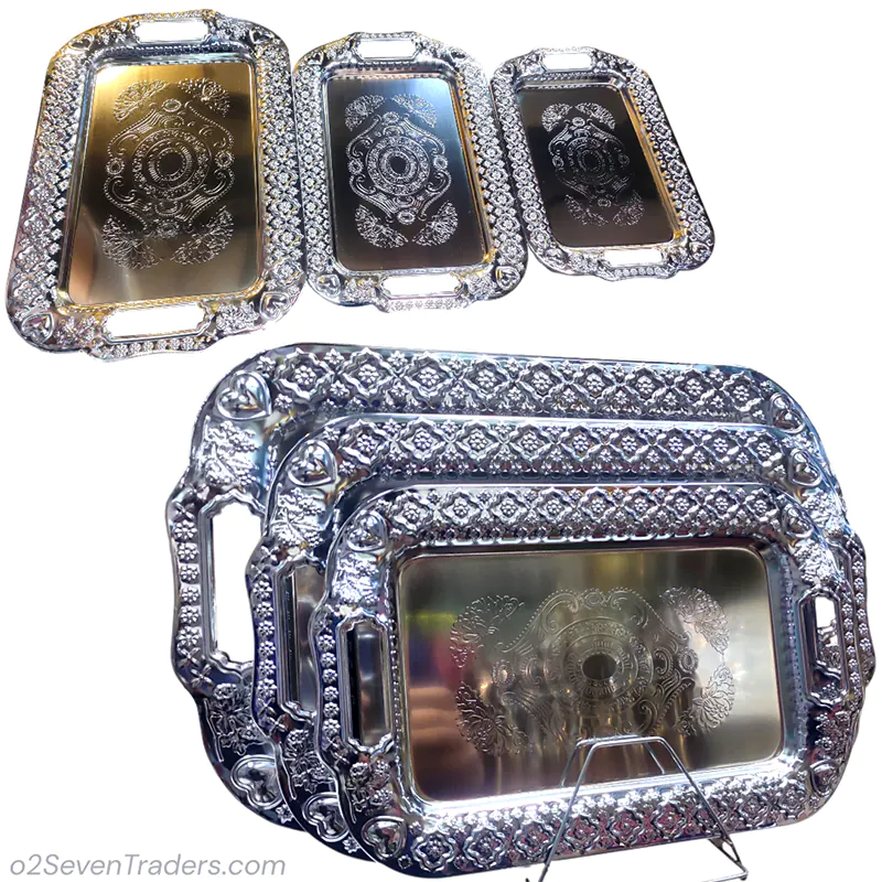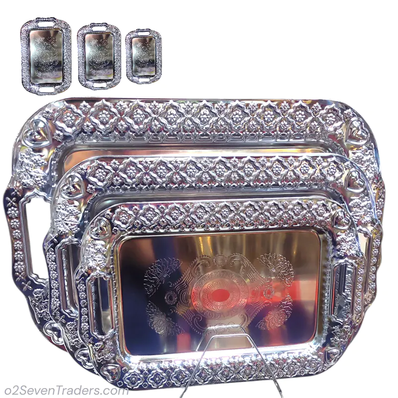 Apni serving ko ek elegant aur stylish touch dein is beautiful 3 Pcs Metal Tray Set ke sath. Iska attractive Shiny Silver dining table, kitchen aur mehmaan nawazi dono ke liye perfect look create karta hai.